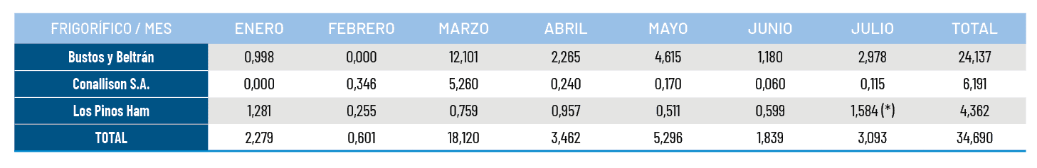CUADRO 3: T EXPORTADAS POR FRIGORÍFICO (ENERO-JULIO 2025)