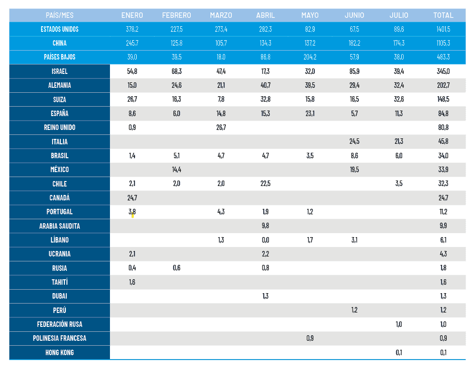 En los primeros 7 meses de 2025 se incrementaron un 16 por ciento respecto de igual lapso del año pasado. Estados Unidos, China y Países Bajos siguen siendo los principales destinos.