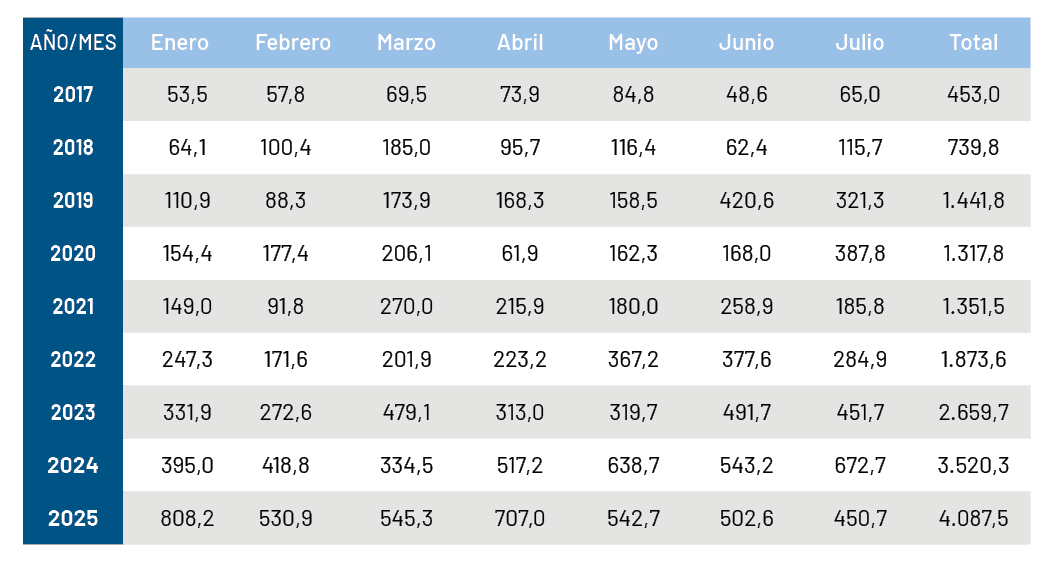 COMPARACIÓN INTERANUAL DE T EXPORTADAS (ENERO-JULIO, ENTRE 2017 Y 2025)